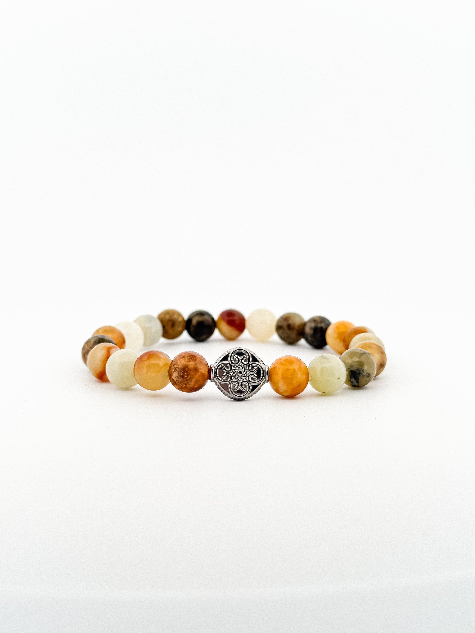 Jade Colourful Silver Coin Engraved Flower Bracelet 8mm