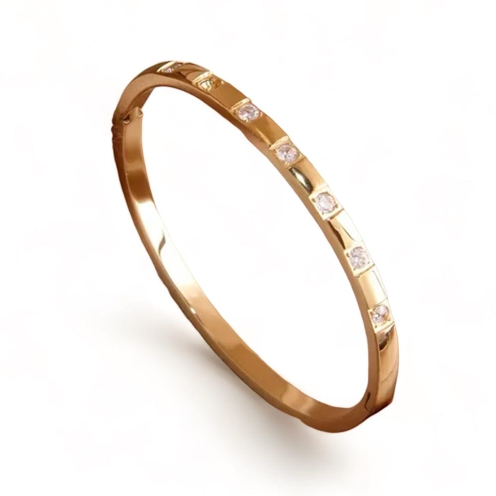 Discover the luxury of the Melba Gold Bangle with mother-of-pearl and sparkling cubic zirconia stones.