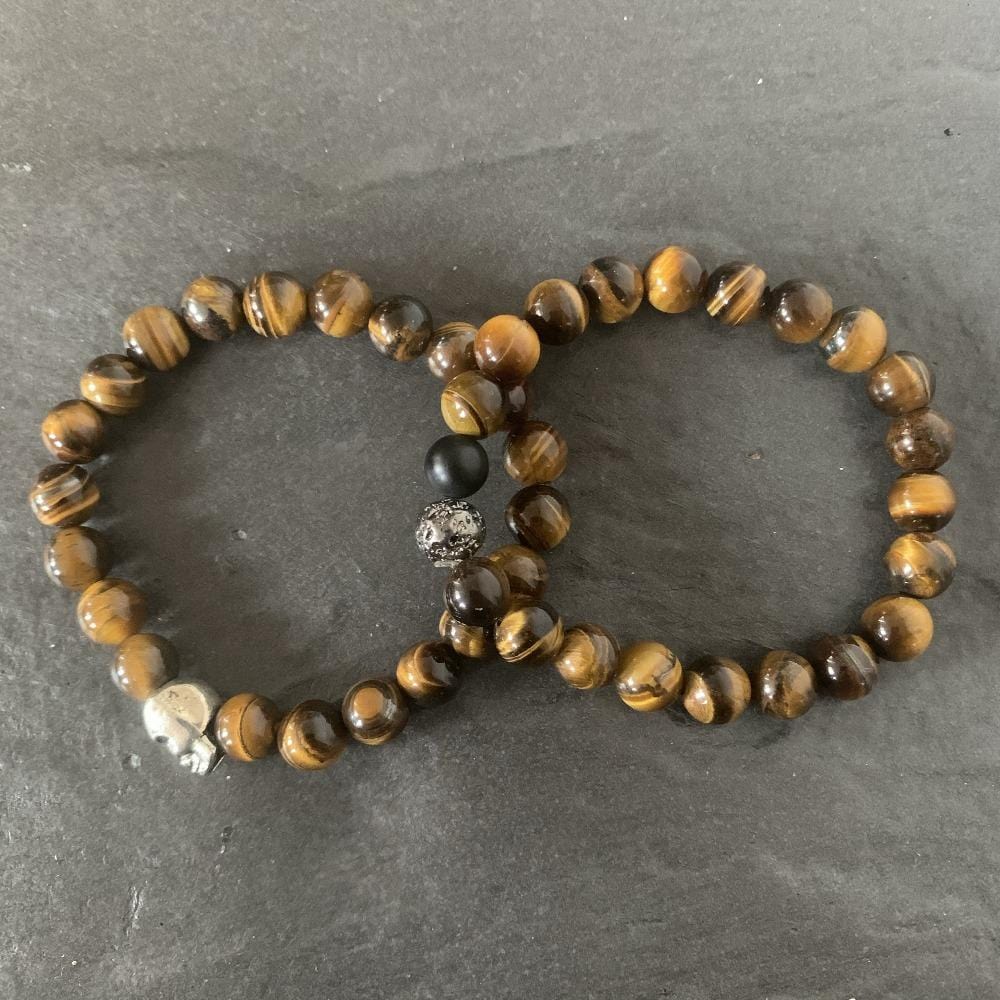 Set : Skull Tiger eye bracelet, Tiger eye with Black onyx and lava stone plated
